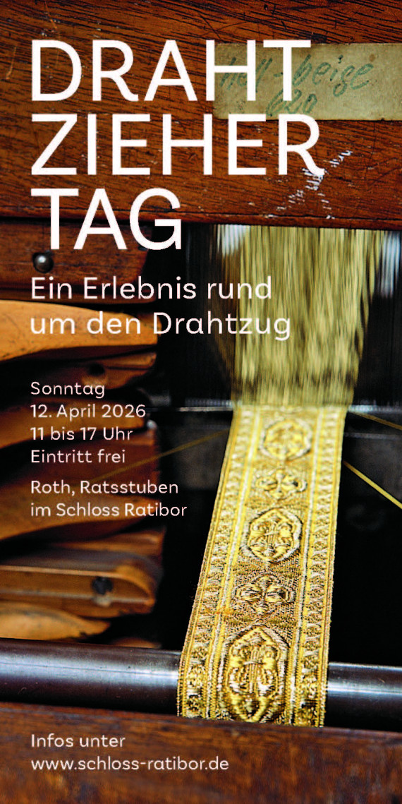 Mit einem abwechslungsreichen Programm lädt der Museumsverbund „Die Drahtzieher“ am Sonntag, 12. April von 11 bis 17 Uhr zu einem Erlebnistag rund um den Drahtzug ein. In den Ratsstuben von Schloss Ratibor in Roth erwecken „Die Drahtzieher“ - das Fabrikmuseum Roth, die GilardiAusstellung Allersberg, das Klöppelmuseum Abenberg und das Museum Schloss Ratibor – mit Vorführungen, Mitmach-Aktionen für Groß und Klein und vielen spannenden Informationen die Geschichte des Drahtzuges im Landkreis Roth zum Leben. Der Eintritt zu den Veranstaltungen und in das Museum Schloss Ratibor ist frei.