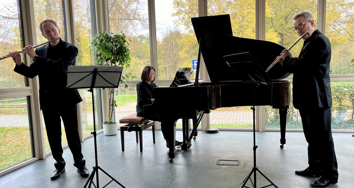 Die erste Veranstaltung fand in diesem Jahr am 27. Oktober 2024 statt. Angekündigt war das Trio Sebastian Fratila (Querflöte), Cristina Bojin (Querflöte) und Enrico Rizzo (Klavier). Nachdem die letzteren beiden kurzfristig absagen mussten, sprangen für sie Heejung Kim (Klavier; Lehrerin an den Musikschulen Roth und Weißenburg sowie Dozentin an der Musikhochschule Nürnberg) und Prof. Marcos Fregnani-Martens (Querflöte; Honorarprofessor an der Musikhochschule Nürnberg und Mitglied bei den Bamberger Symphonikern) ein. Unter dem Veranstaltungstitel „Einmal um die Welt“ führten sie ihre aufmerksamen Zuhörer – begleitet durch launige Ansagen von Sebastian Fratila (Lehrer an den Musikschulen in Roth und Weißenburg sowie Mitglied in diversen Ensembles) – virtuos durch Länder wie Deutschland, England, Frankreich, Rumänien, Israel, China und Argentinien.