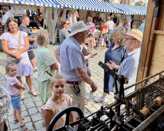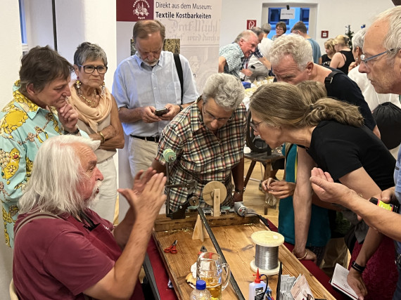 Das Fabrikmuseum war dort traditionell wieder mit einem Schau- und Verkaufsstand präsent, an dem es eine Bänder-produzierende Maschine zu sehen und natürlich eine große Auswahl an leonischen Borten und Bändern zu kaufen gab. Der Stand, in diesem Jahr mit einem neuen Giebelbanner versehen, war sehr gut besucht und eine wirksame Werbung für das Museum. Wie jedes Jahr war unsere altehrwürdige, störungsfrei laufende Häkelgalon-Maschine die große Attraktion und Gegenstand vieler interessanter Gespräche mit den Besuchern.
